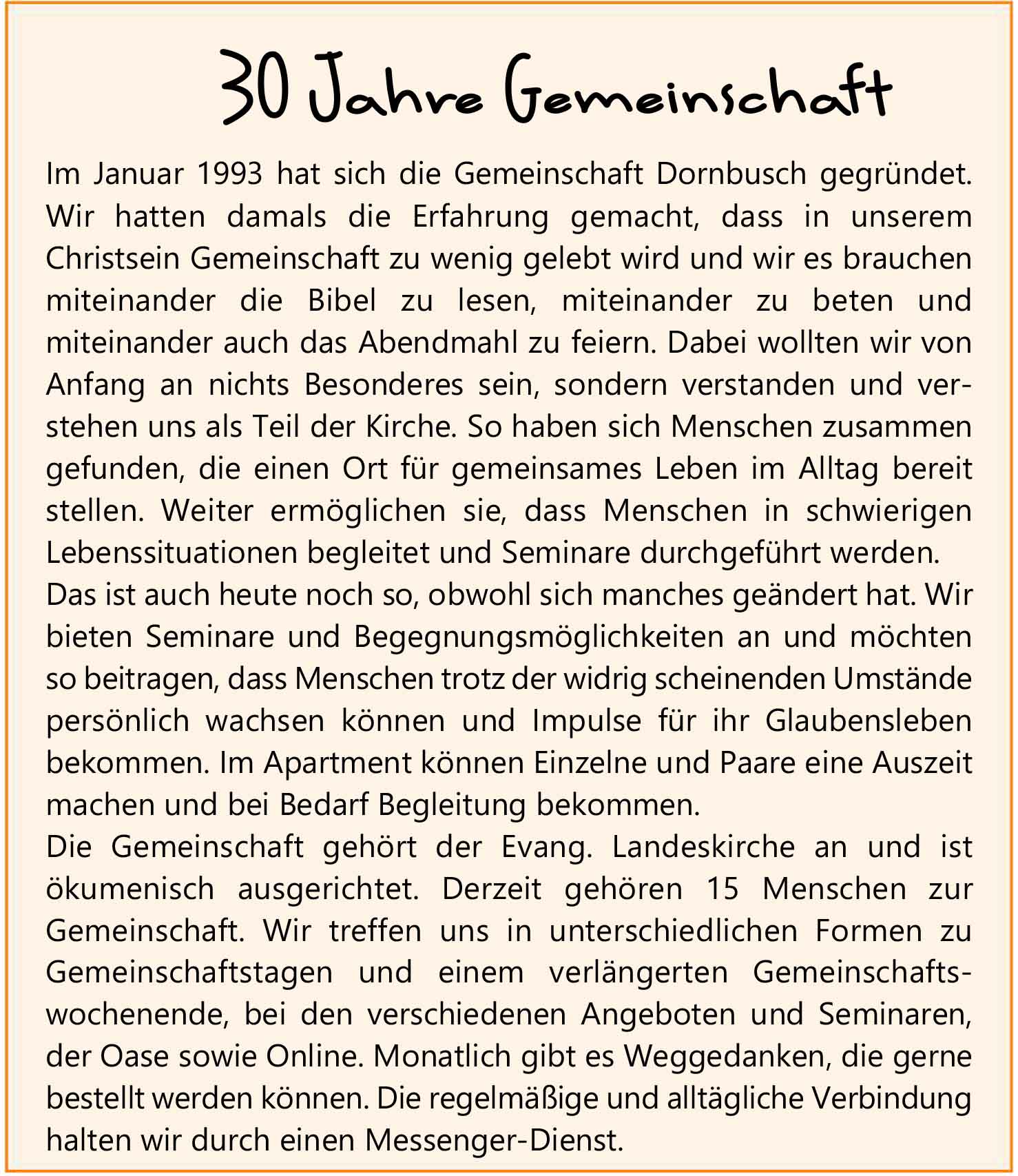 Die Gemeinschaft Dornbusch hat ihre Anfänge im Herbst 1990 und hat sich 1993 verbindlich zusammengeschlossen. Einige Familien, Ehepaare und Alleinlebende haben jeweils für sich die Erfahrung gemacht, dass im Christsein Gemeinschaft zu wenig gelebt wird und merkten, wie wichtig es ist, MITEINANDER die Bibel zu lesen, zu beten, sich auszutauschen und das Abendmahl zu feiern.